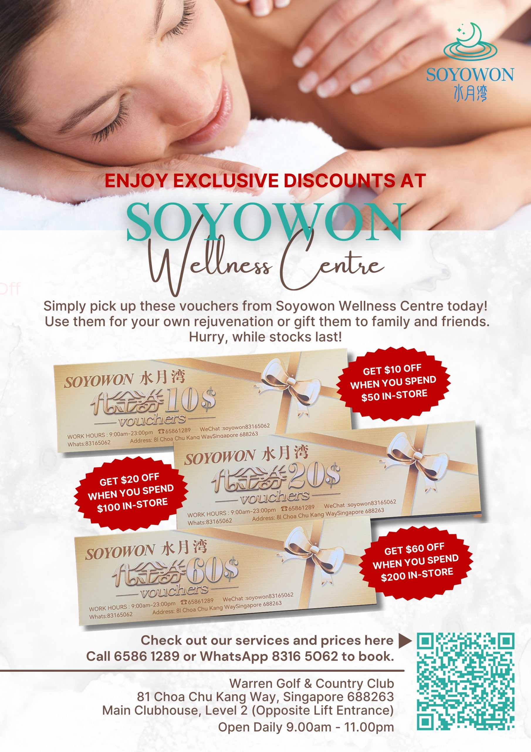 Introducing the new Wellness Centre at Warren. Step into a haven of relaxation and rejuvenation. Soyowon Wellness Centre invites you to experience a new level of self-care and serenity right here at the Club. Services include Special Head Therapy, Aromatherapy, Facial Care, Copper Pot Heat Therapy, Acupressure, Ear Care and more.